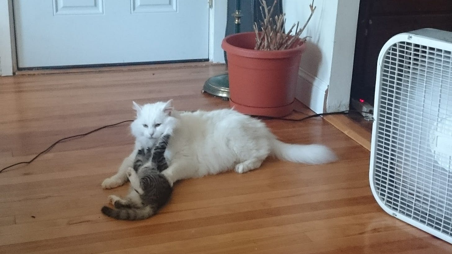 Eventually, yes, but he’s a highly territorial male who prowls his property and defends it. It takes time for him to adjust to another cat. The exception is Mina. I got her when she was a wee baby, so she’s grown up with Shredder. From the first time I brought her home, he acted like a papa to her. Never hurt her, groomed her, played, and slept with her. They’re still good friends.